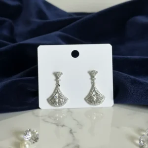“Stunning silver-toned drop earrings with fan-shaped crystal details. Anti-tarnish and lightweight for timeless sparkle. Styling Tip: Perfect for pairing with sarees, gowns, or party outfits for a chic, elegant finish.” PRODUCT INFORMATION Material Plating Stainless Steel silver-Plated