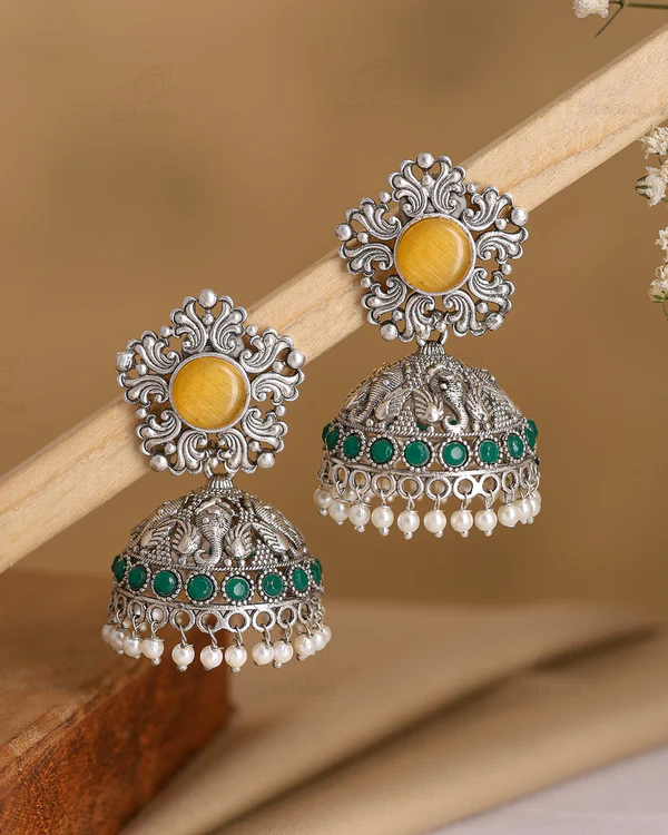 Add a vibrant ethnic touch to your jewelry collection with these oxidised silver jhumka earrings. Featuring a bold yellow stone centerpiece set in an intricately carved frame, paired with green stone detailing on the dome, this pair is beautifully finished with classic jhumka drops and delicate pearl accents. A perfect mix of color, tradition, and statement style.