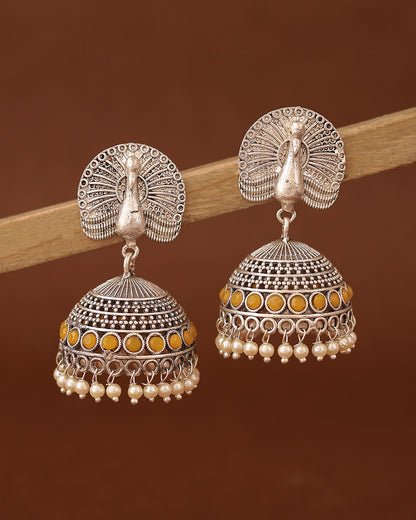 Antique Peacock Silver Oxidized Jhumka Earrings – Yellow Stone & Pearl