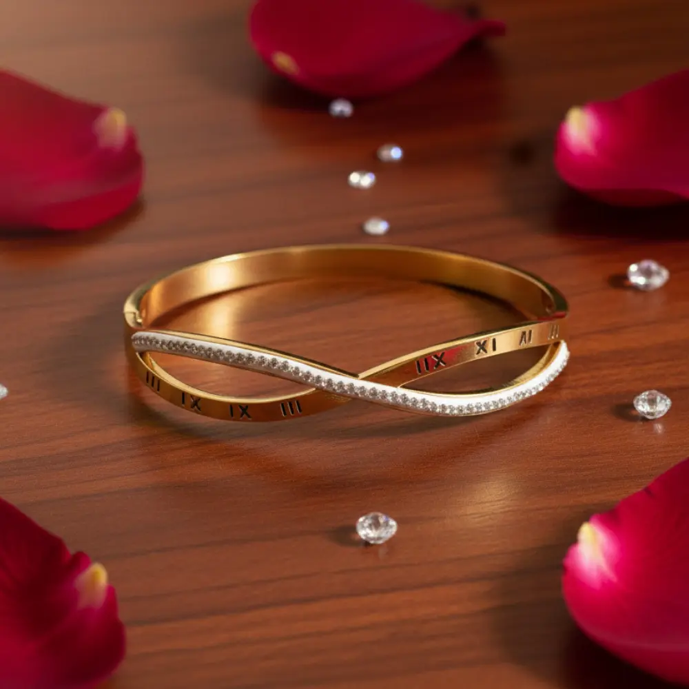 Elevate your jewellery collection with this Dual Layer Roman Numeral Kada Bracelet, featuring a unique double-band design. One band is adorned with sparkling stones, while the other showcases classic Roman numeral engravings, blending timeless elegance with modern sophistication.